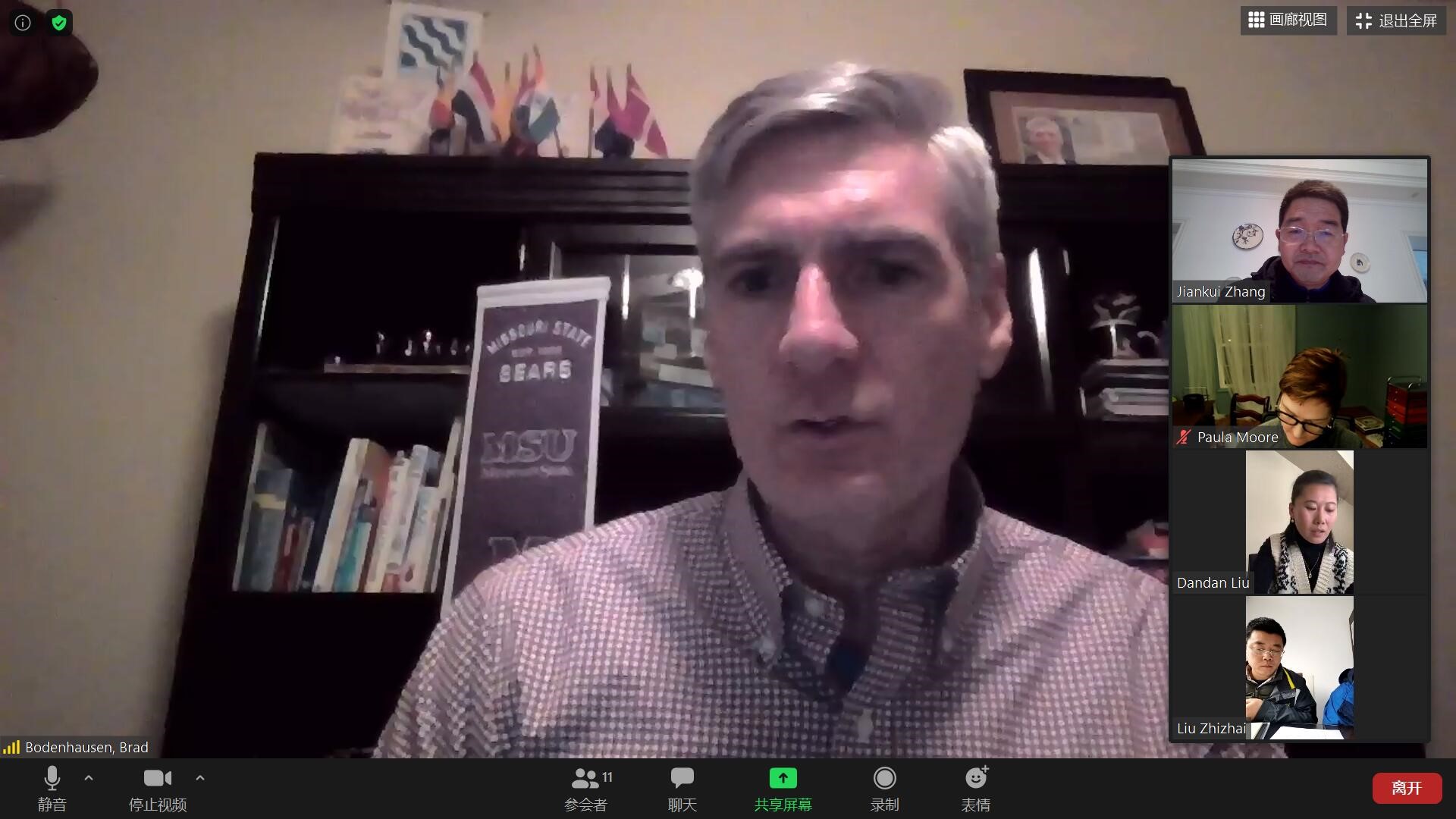 在学院与美国密苏里州立大学(MSU)双方的共同努力下,植物科学与技术专业的英语课程教学稳步有序推进。为及时反馈教学效果,确保教学质量,合作双方于北京时间2月2日上午9:00召开了线上教学研讨会,MSU助理副校长Brad Bodenhausen、英语教师Paula Moore、Kevin James、Angela Rose及学院中外合作办学相关教师参加,会议由MSU国际领导力培训中心主任Dandan Liu和学院中外合作办学办公室主任刘志斋主持。