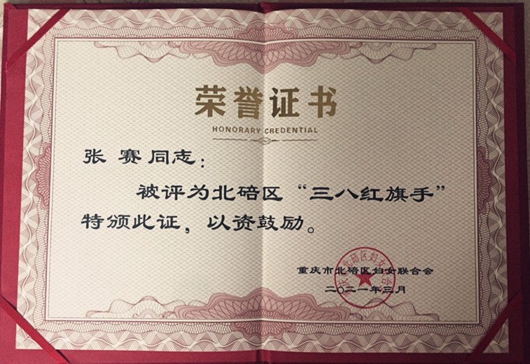 张赛老师获得北碚区2021年“三八红旗手”荣誉称号。