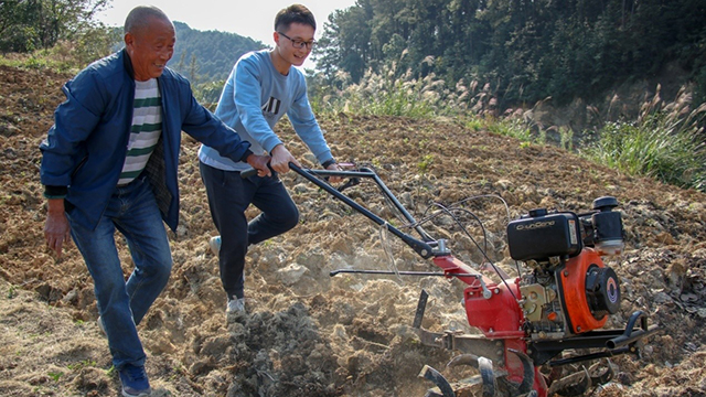 图 学生在老农人指导下学习使用旋耕机
