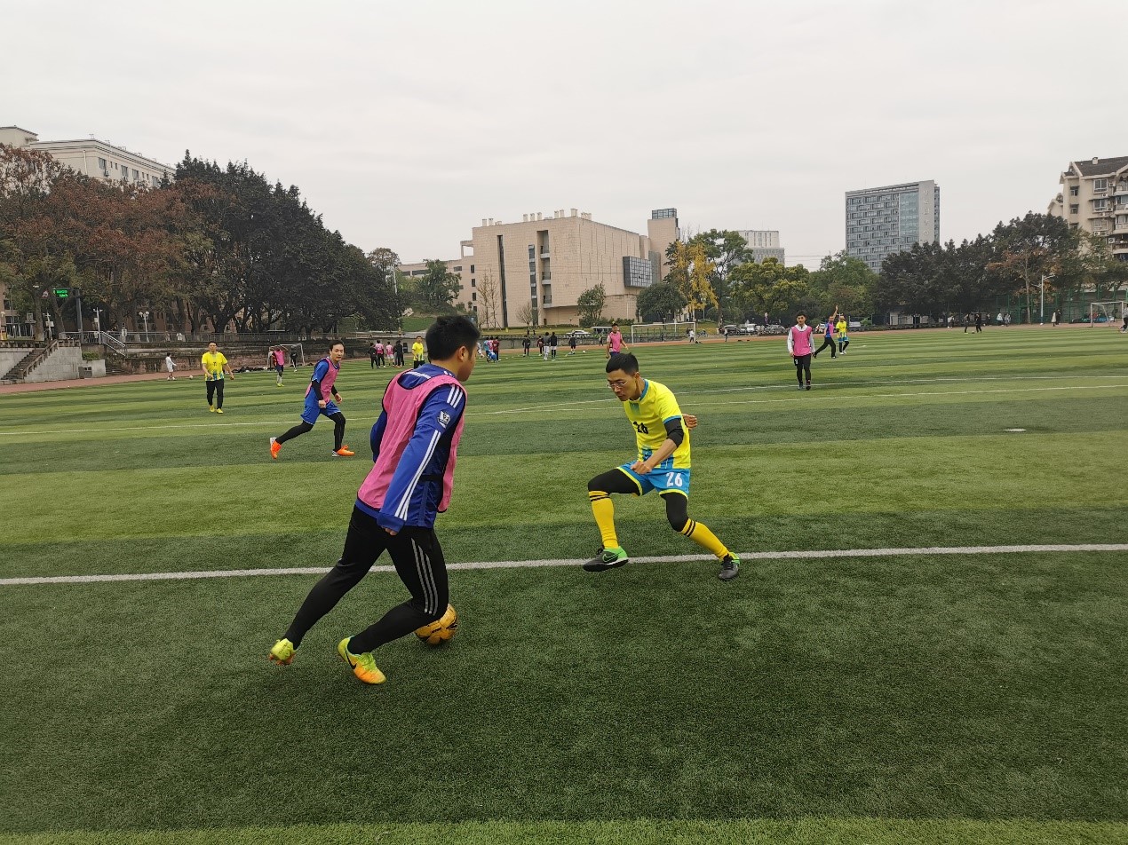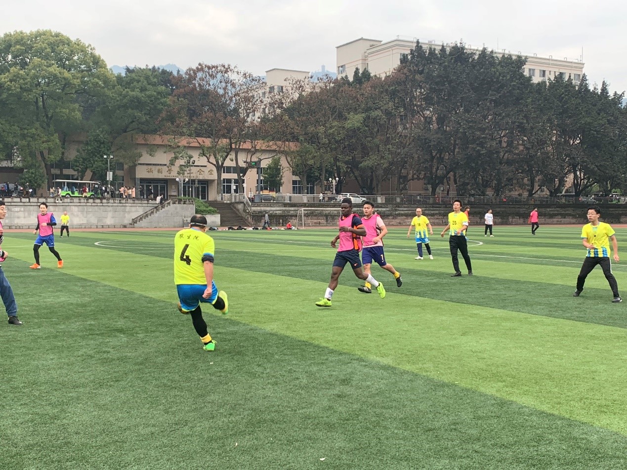 研究生队实力强劲,带球速度快,精力充沛,抢断积极,其中不乏来自非洲和南亚的留学生,而老师们以经验和球感见长,跑位准确,脚法精良,配合默契,双方可谓实力均衡。由于教师队大多是七零后和八零后,所以同学们允许老师多次换人,以弥补体能欠缺。场上精彩不断,比分交替上升。中场休息时教工队以1比3落后,下半场重整旗鼓,聚力再战,借助于犀利的进攻结合密集的防守,最终教工队以7比4结束全场比赛。