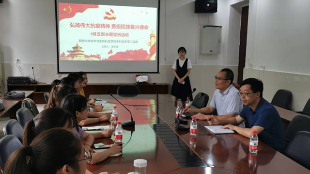 本科生农学二支部指导开展“弘扬伟大抗疫精神,勇担民族复兴使命”主题党日。学院党委书记阳义健、组织员薛中华和党支部全体党员参加活动,党支部书记吴东倩主持活动。