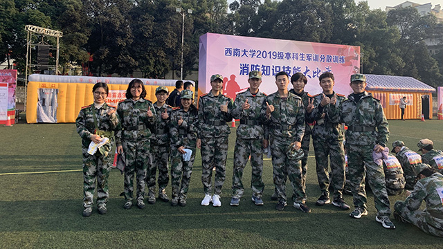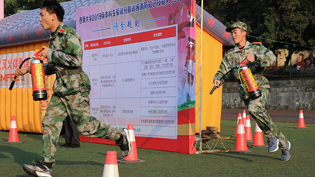 2019级本科生军训分散训练—消防知识技能大比武活动。一楼一凤