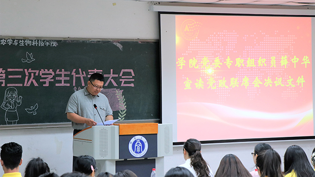 正式会议中,首先由学院党委书记赵子华宣读学院党委批复并讲话。他对筹备大会的老师同学的辛苦付出表示了肯定,并合习近平总书记七年知青岁月的奋斗经历,以及对当前农科人才培养目标,向在座的学生代表们提出了要求并寄予厚望。接着,一楼一凤