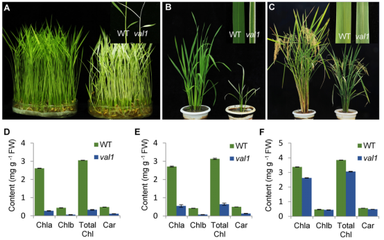 何光华教授团队首次分离鉴定了一个水稻白化转绿叶突变体virescent-albino leaf 1(val1)。从苗期到成熟期,val1叶片从白化逐渐转变为绿色,是一个受生育进程调控的白化转绿叶突变体。通过遗传学、细胞学、分子生物学等手段,揭示了VAL1编码一个定位在叶绿体上的磷酸核糖胺-甘氨酸连接酶,参与嘌呤核苷酸的生物合成。研究结果一方面明确证实了VAL1是嘌呤从头合成途径中的关键酶,参与调控水稻叶绿体的发育;同时为水稻高光效育种提供一个具有育种价值的转绿型叶色突变体。