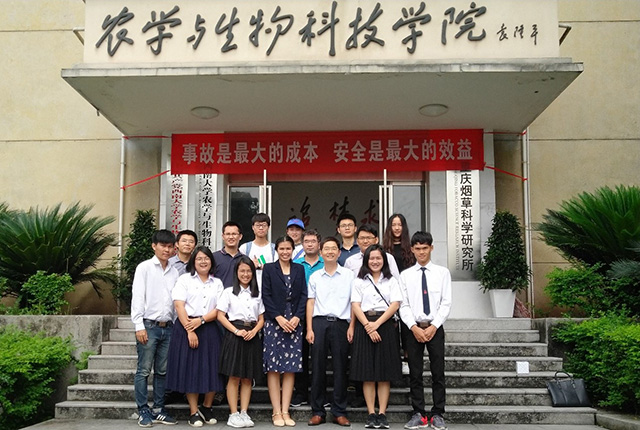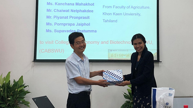 2018年6月19日上午,在院办412会议室,学院举办仪式热烈欢迎泰国孔敬大学农学院(AGKKU)到访的Tidarat Monkham博士及5名交换生。参加欢迎会的有副院长张建奎,外事秘书刘志斋,指导老师代表赵芳明、刘勋等,以及今年暑期即将赴AGKKU交换学习的一楼一凤