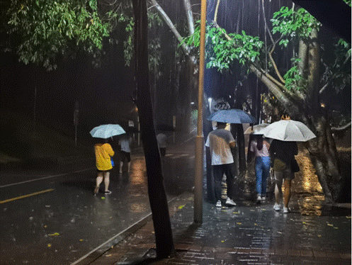 图:凌晨,志愿者充分利用休息时间筹备活动,工作结束后冒雨返回宿舍时的最美背影
