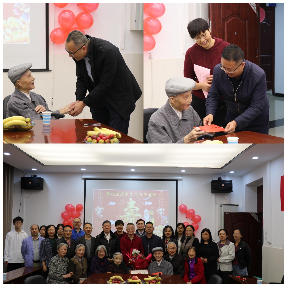 退休教师王康老先生迎来了他的百岁寿辰,依照重庆习俗,学院为老先生策划了这场别开生面的百岁寿辰茶话会。学院领导及在职、退休教师代表和王康老师的好友同事们参加了茶话会,共同祝福王康老师生日快乐,福寿安康!院老协小组长孙泽江老师献上鲜花及祝福,教研组同事吴珍龄老师献上自己创作的“双寿”图表示祝贺。王三根老师作为王康老师的学生代表向大家讲述了老先生在教育科研工作上无私奉献、与时俱进,敢为人先的精神。