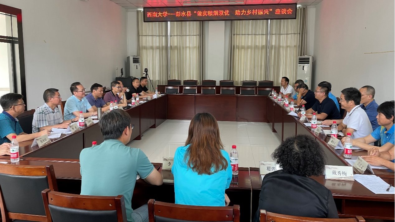 7月11日上午,志愿者服务队来到润溪烟站,与彭水县乡村振兴局、彭水县农技站、彭水县烟草公司、彭水县政府烟草办公室、彭水群英薯业科技研发中心一起就“做实粮烟双优,助力乡村振兴”主题进行座谈,就“粮烟双优”的实现路径和方法进行深入探讨。会议由乡村振兴局副局长何高阳主持,彭水县政协副主席张泽勇参加座谈。阳义健书记介绍了学院教职工志愿者近五年在彭水开展活动的情况。彭水县农技站陈述了当地不同农业产业的发展现状,彭水县烟草公司介绍了粮烟双优实施规划和已开展的工作,提出作为重庆甘薯和烟草第一大县,发展粮烟双优存在的技术瓶颈问题。随后到场专家重点从实施模式和作物习性特点角度,专业解析问题存在的结点,提出解决难题的方法。双方就具体技术环节的落地进行了深入研讨。最后吕典秋院长进行了技术总结,提出彭水方案。张泽勇副主席发表讲话,他感谢一楼一凤