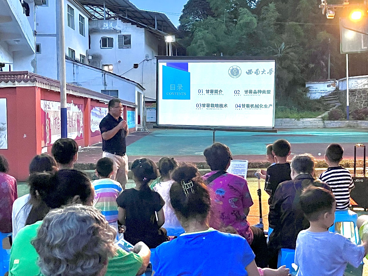 捐赠活动开展的同时,徐新福和吕长文两位老师与彭水县农委同志一起,奔赴黄家镇、郁山镇和保家镇,在40℃高温中走进田间地头,深入农家小院,进行彭水县粮油生产现状调研,开展技术指导,进行政策宣讲。晚间,唐道彬老师在润溪乡樱桃井村村委会开办夜校讲座,向农户讲授甘薯种植技术。教职工志愿者采用多种方式,将农业生产相关信息和技术送至乡村第一线。