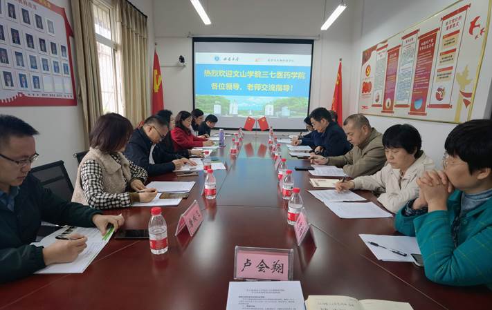 对文山学院的大力支持和帮助。毛忠顺博士介绍了三七医药学院的基本情况和目前在教育教学中遇到的困难,希望通过外聘师资、科研合作等形式推动两院开展全方位、常态化的联系交流,以更灵活的方式在更高层次、更宽领域深化合作,为三七医药学院实现高质量发展增添新动能新优势。