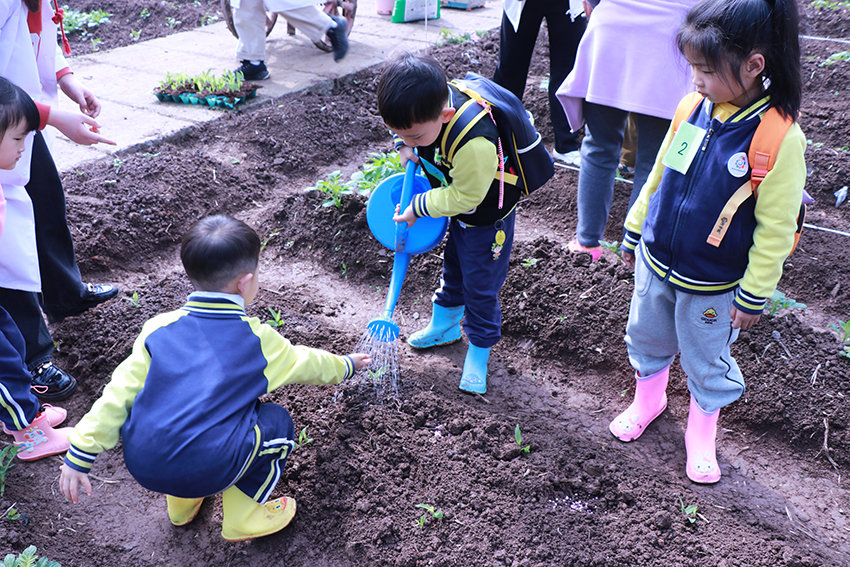 在赵勇老师的讲解、示范和指导下,各小组顺利开展玉米移栽。小朋友们在志愿者的带领下了解了如何取苗、刨坑、如何培土压土、施肥浇水等移栽的过程。小朋友们仔细观测、默契配合、刨土挖窝、移栽种苗、拎桶浇水,时不时看看小玉米苗是否移栽端正。每一个步骤都一丝不苟,整个流程井然有序,现场一派热火朝天的景象,一株株玉米幼苗迎着春天的阳光在田垄上安家落户,展露出勃勃生机。