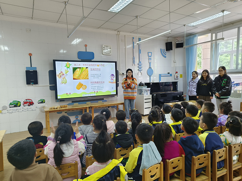 实验幼儿园中(8)班进行农业知识科普宣讲,通过知识讲解、实物展示、动画演示、游戏互动等形式带领孩子们进行了一场“玉米生长大闯关”,让孩子们清晰直观的感受到了玉米生长的奥秘,认识到了珍惜粮食、节约粮食重要性。课堂上孩子们积极踊跃,一片欢声笑语。