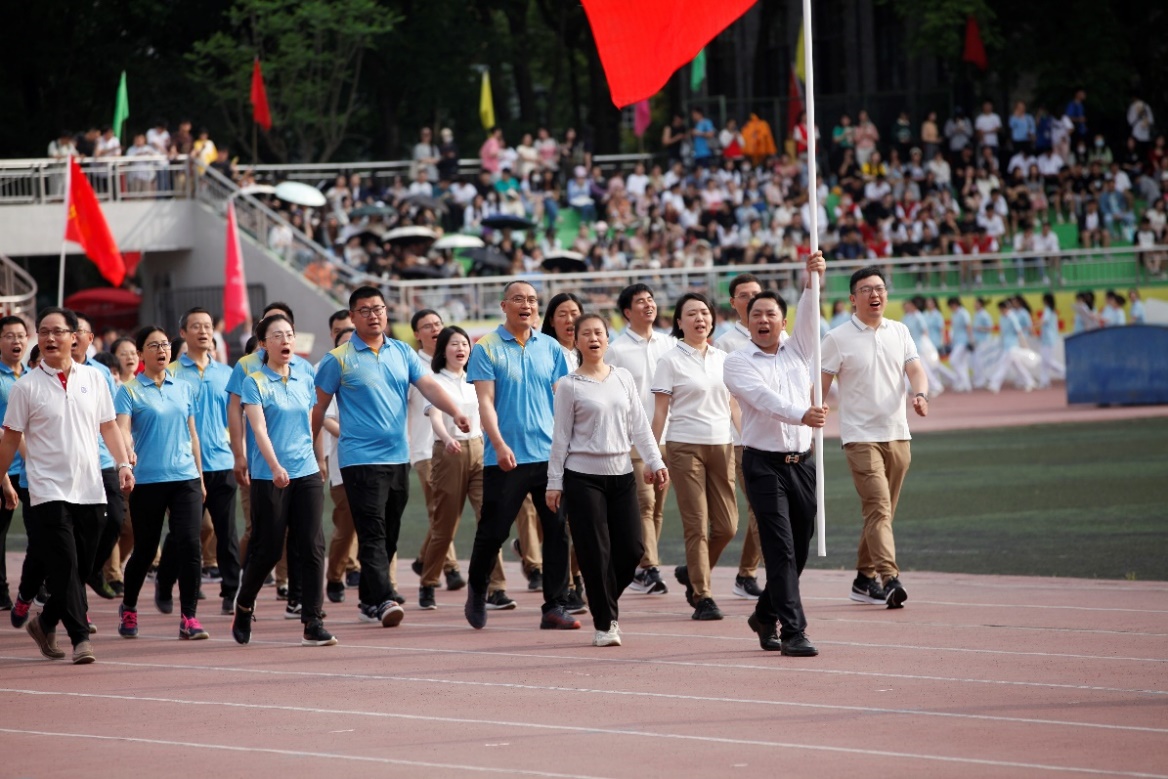 的校园里既有郁郁葱葱的夏,也有落叶满地的秋,霎时有了她别一样的美。美景迎盛事,4月20日上午8:30,在嘹亮的《运动员进行曲》中,由学校女子国旗方正领衔、校庆方队、教工方队以及学生方队紧随其后的40余方队有序入场。在入场式上,教工方队以“播撒希望,收获荣光,山高水长,养育栋梁”的口号俘获一众学子的芳心,学生方队结合学院的特色,各展所长,赢得了阵阵的喝彩声。随后,在飘扬的国旗下,在腾舞的彩烟中,一楼一凤