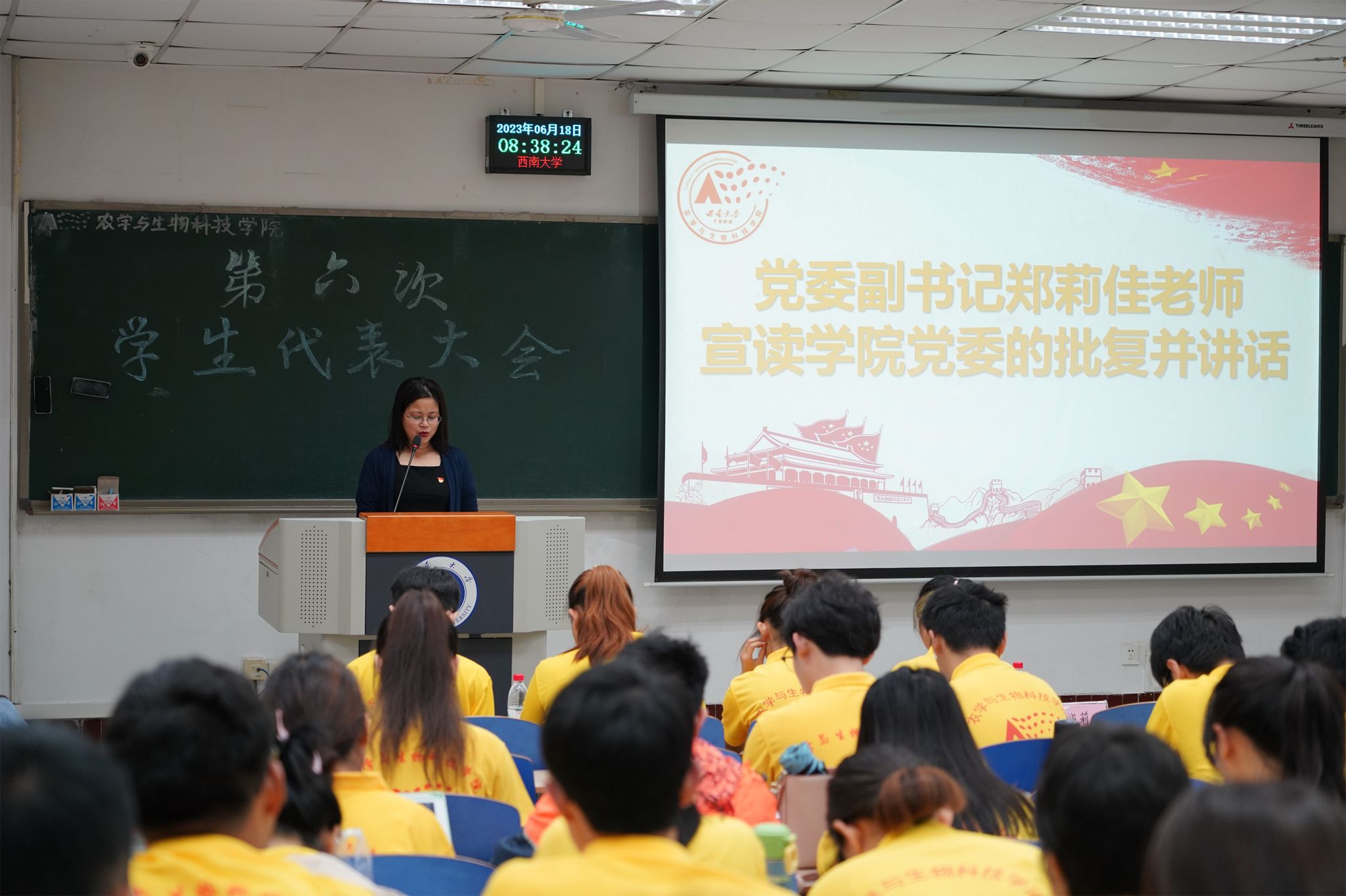 上午8:30,大会正式会议开始,学院党委副书记郑莉佳宣读学院党委批复并讲话。她充分肯定了过去一年一楼一凤