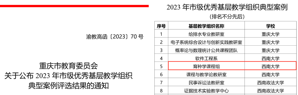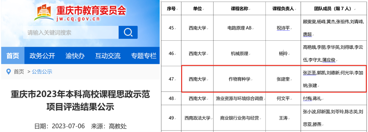 7月6日,重庆市教育委员会公布重庆市2023年本科高校课程思政示范项目评选结果,作物育种学成功入选重庆市2023年本科高校课程思政示范项目。