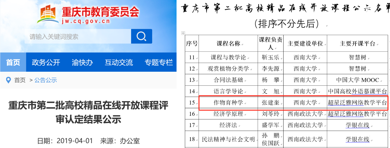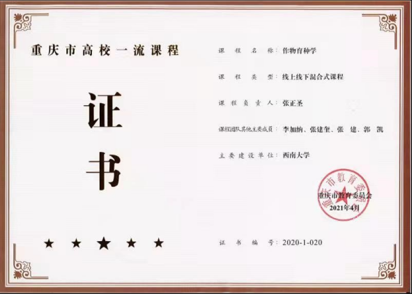 作物育种学课程还于2019年被评为重庆市高校精品在线开放课程,2020年入选重庆市一流本科课程(线上线下混合式)。
