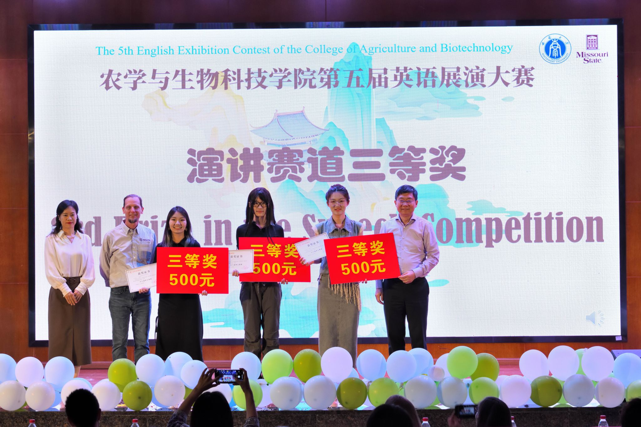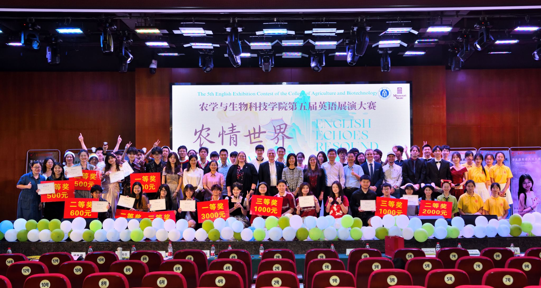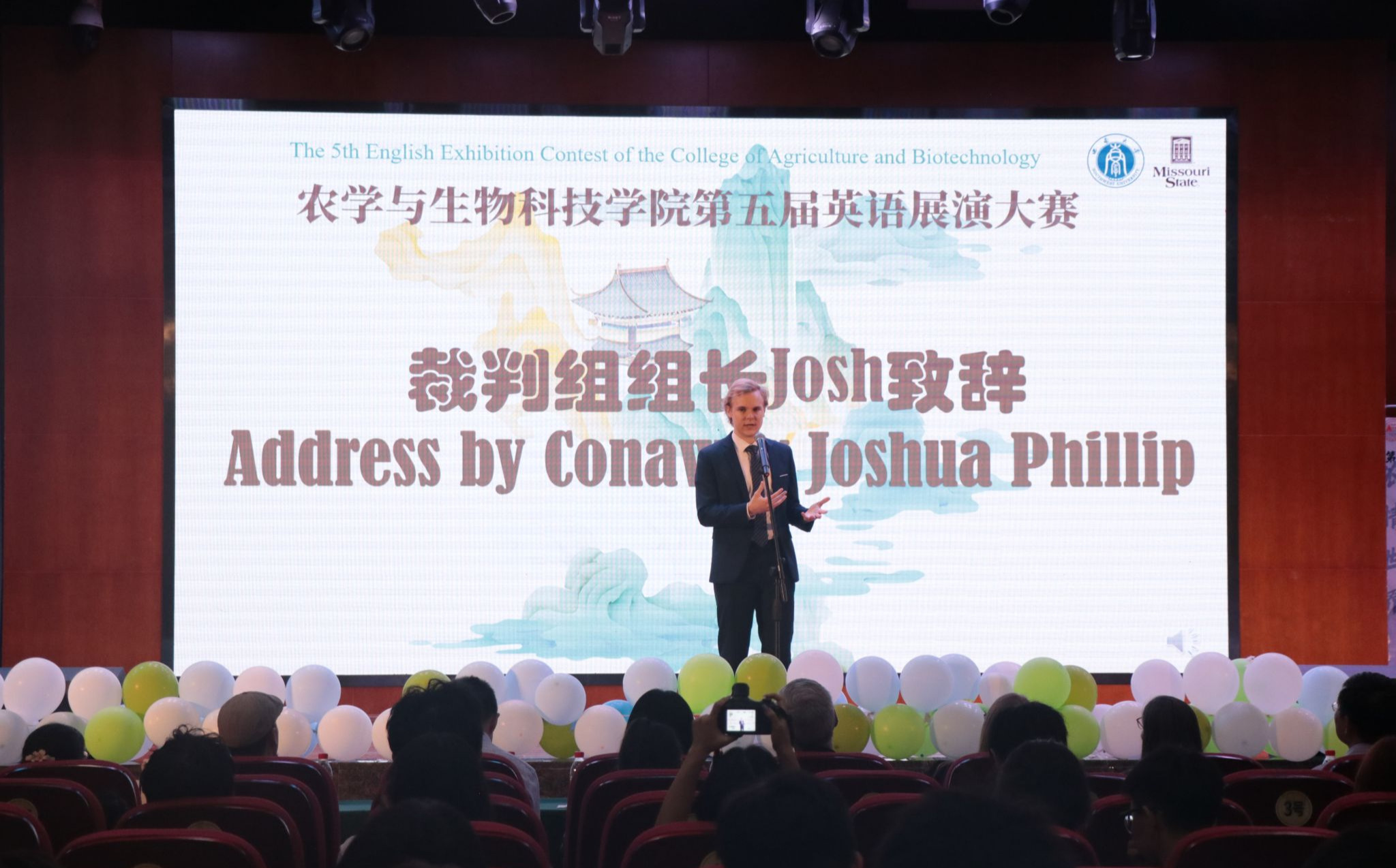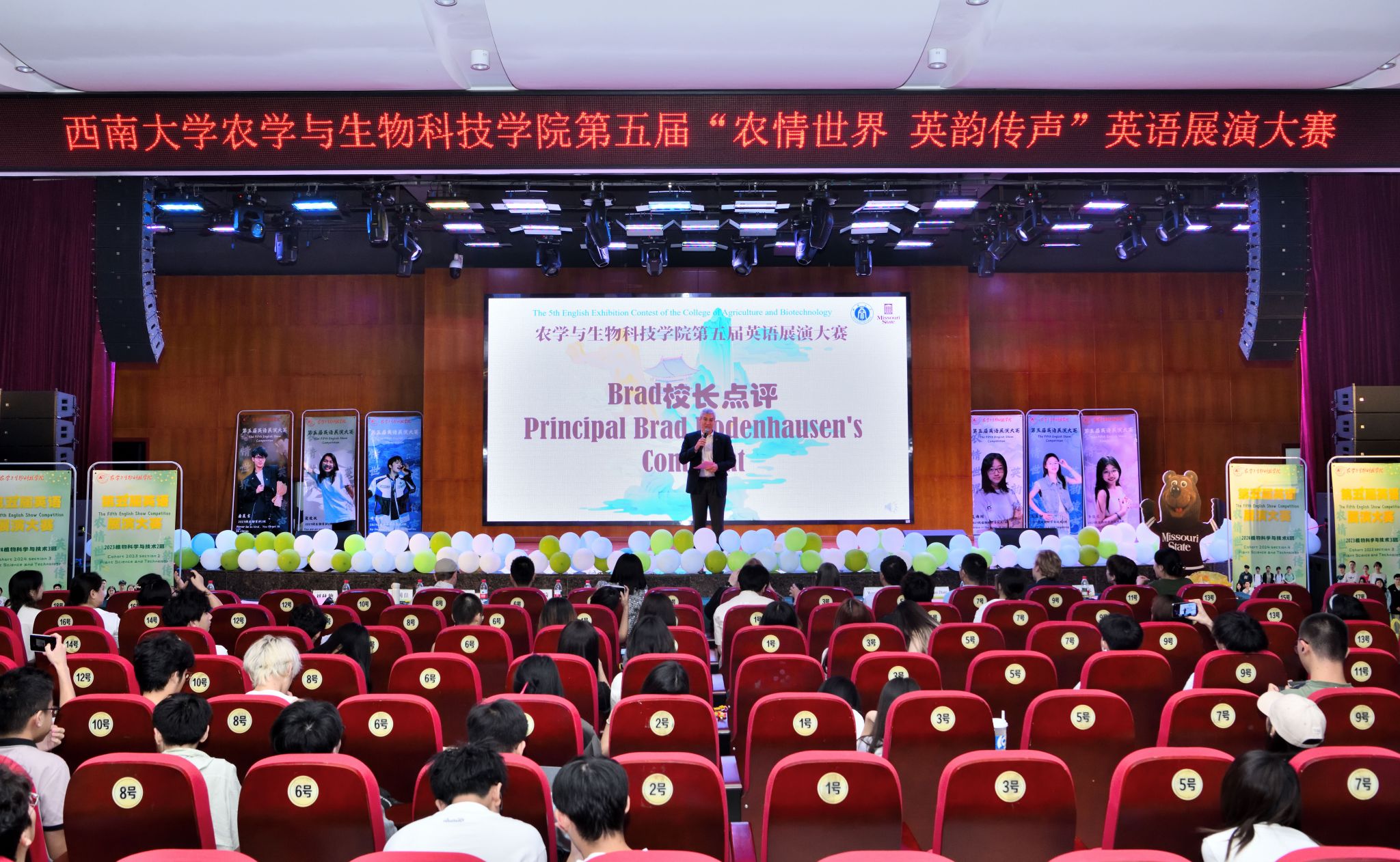 第五届“农情世界,英韵传声”英语展演大赛在南区学生活动中心107圆满落幕。密苏里州立大学副校长Brad Bodenhausen,密苏里州立大学农生院院长Melissa Bledsoe,密苏里州立大学农业科学与保护系系主任Lacy Sukovaty,密苏里州立大学农业科学与保护系讲师Jacob Schneider,密苏里州立大学英语语言中心(ELI)讲师Joshua Conaway,密苏里州立大学中国项目执行主任Dandan Liu,密苏里州立大学杰出教授、葡萄生物技术中心主任Wenping Qiu,一楼一凤