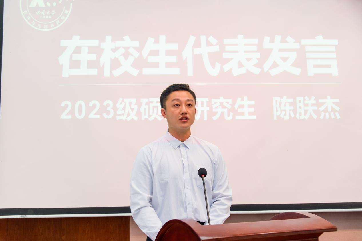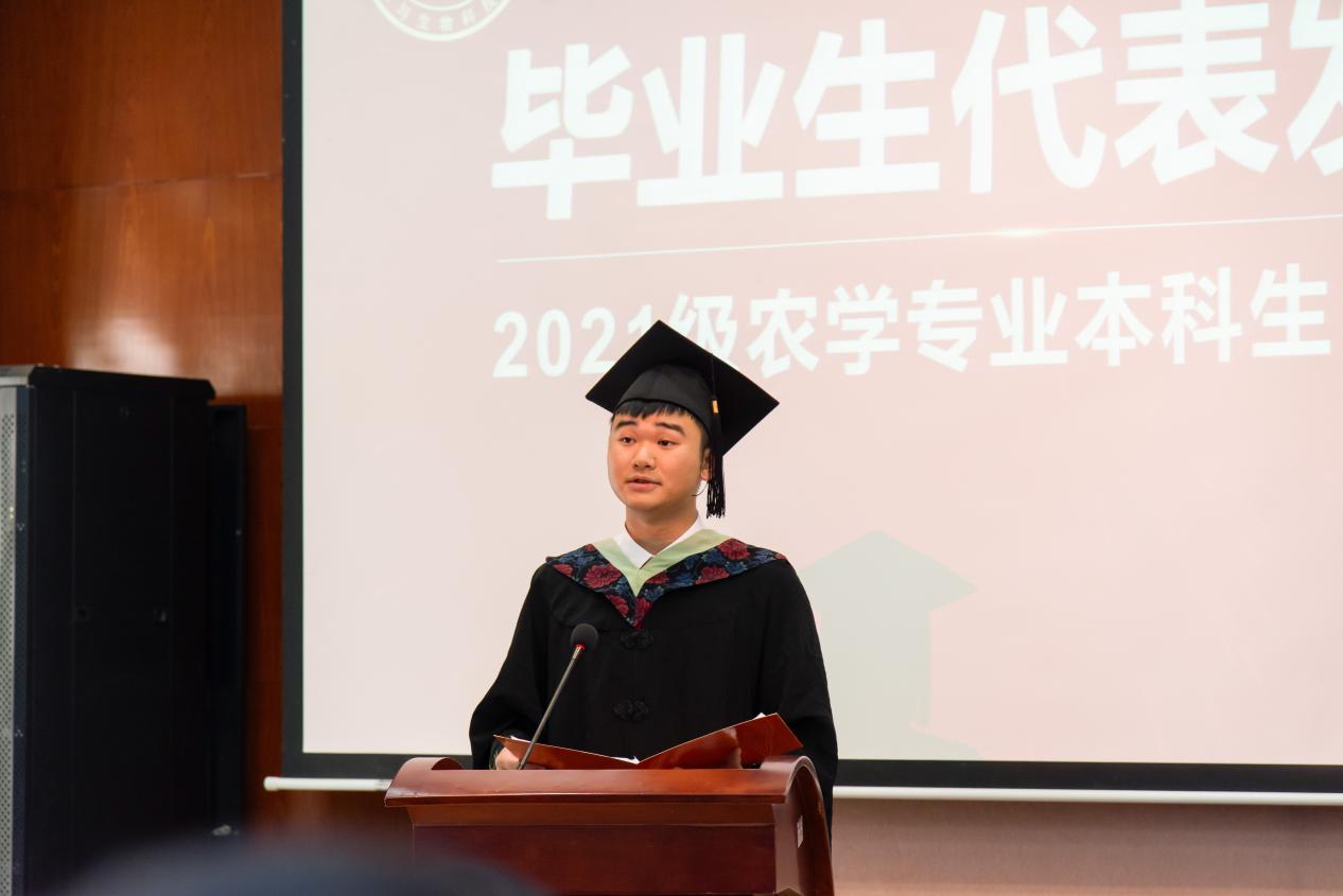 2021级农学专业本科生罗泽江作为毕业生代表发言,他深情回顾了在袁隆平精神感召下度过的四年求学时光,那些在实验室通宵达旦、在田间挥汗如雨的日子犹在眼前。“那些看似平凡的积累终将在专业领域绽放出独特的价值光芒”,他鼓励同窗在未来秉承校训、躬耕不辍续写无愧于时代和母校的辉煌。在校生代表2023级遗传学专业硕士研究生陈朕杰向毕业生们送上真挚祝福,承诺将传承学院追梦求实的精神,在学术高峰上不断攀登。