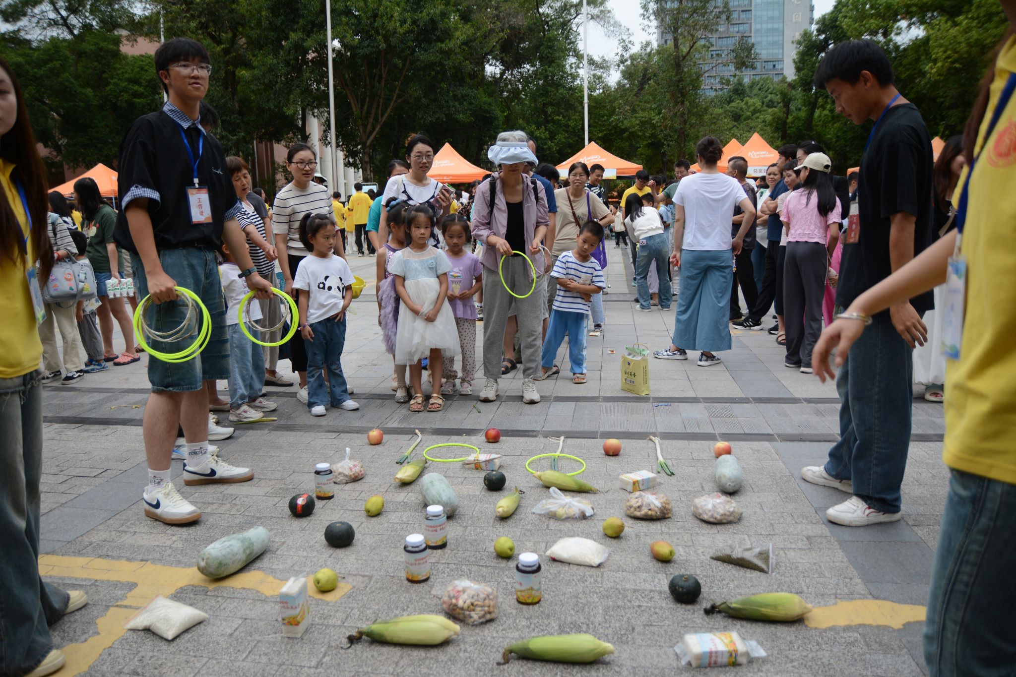 活动还设置了农事竞赛活动,涵盖团体赛和个人赛。在比赛现场,“颗粒归仓”“浑水摸鱼”“硕果累累”“辨识五谷”等充满农村农事特色的竞赛项目接连展开,随着计时器滴答作响,“浑水摸鱼”比赛拉开帷幕,队员们迅速弯腰伸手,滑溜溜的泥鳅和偶尔脱手的鲤鱼跃向空中,引得一片惊呼声。个人赛场地被参赛选手和观众围得里三层外三层,“辨识五谷”“不失圭撮”“花灯盏盏”等项目紧张而激烈地进行着。选手们各展其能,奇思妙想频出,彰显出西大学子的无限智慧与创造力。整个运动场欢笑声、加油声、喝彩声此起彼伏,气氛十分热烈。这些竞赛项目全部源于农村日常农事,展示农业生产的不易以及农民朋友日常活动的趣味性。参与的师生们通过亲自体验,既体会到劳作的艰辛,又分享了收获的喜悦,从而真正懂得珍惜粮食、热爱劳动,也让传统农耕文化在欢声笑语中活起来,增强了农科专业学子的认同感,坚定了他们对农科专业的自信。