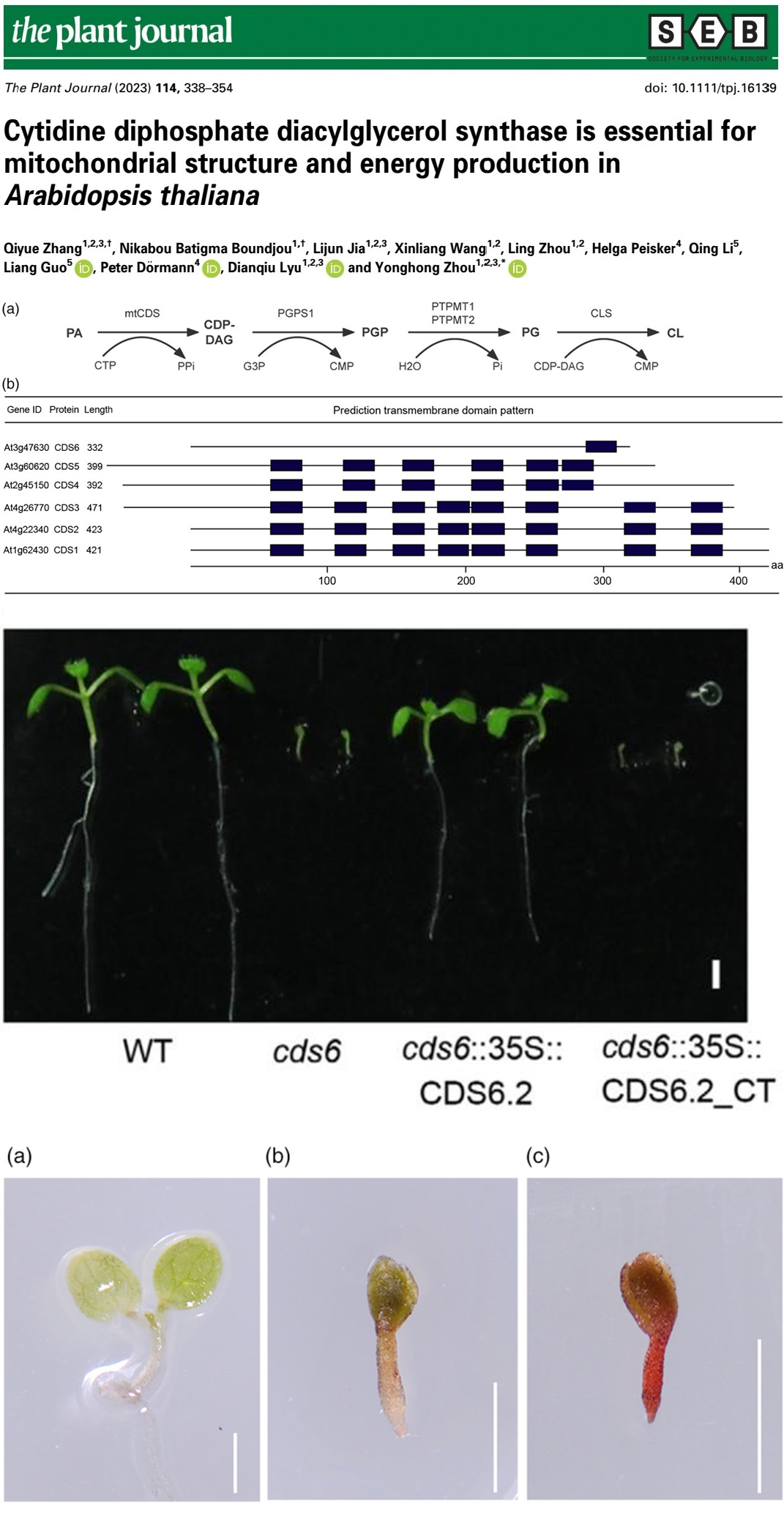 胞苷二磷酸二酰基甘油(CDP-DAG)是原核生物和真核生物中甘油磷酸脂生物合成的重要中间体。在不同细胞器中,CDP-DAG合酶(CDS)可催化合成特定的阴性磷酸甘油脂。前人的研究表明拟南芥CDS是膜内在蛋白,由一个小家族基因(被命名为CDS1-CDS5)编码。其中,CDS1、CDS2和CDS3位于内质网,CDS4和CDS5位于质体。然而,线粒体作为另一个脂质合成的场所,它所需的CDP-DAG的生物合成仍有待研究。该研究鉴定了一个线粒体特异性CDS蛋白,并命名为CDS6,进一步研究发现CDS6对于PG和CL在线粒体中的生物合成是必不可少的,这对线粒体内膜结构建成、TAG降解、能量代谢和幼苗发育至关重要。该研究以“Cytidine diphosphate diacylglycerol synthase is essential for mitochondrial structure and energy production in Arabidopsis thaliana”为题近期发表在生物学一区杂志《The Plant Journal》上,IF2022=7.091。2019级植物科学与技术专业本科生张琦玥为本文的第一作者,已毕业国际硕士研究生Nikabou Batigma Boundjou为共同第一作者,指导老师周永洪副教授为通讯作者。该论文受到了国家重点研发计划项目(2018YFE0127900)、中央高校基本科研业务费专项资金(SWU118109)、科技部科技合作计划项目(KY201904016)、一楼一凤