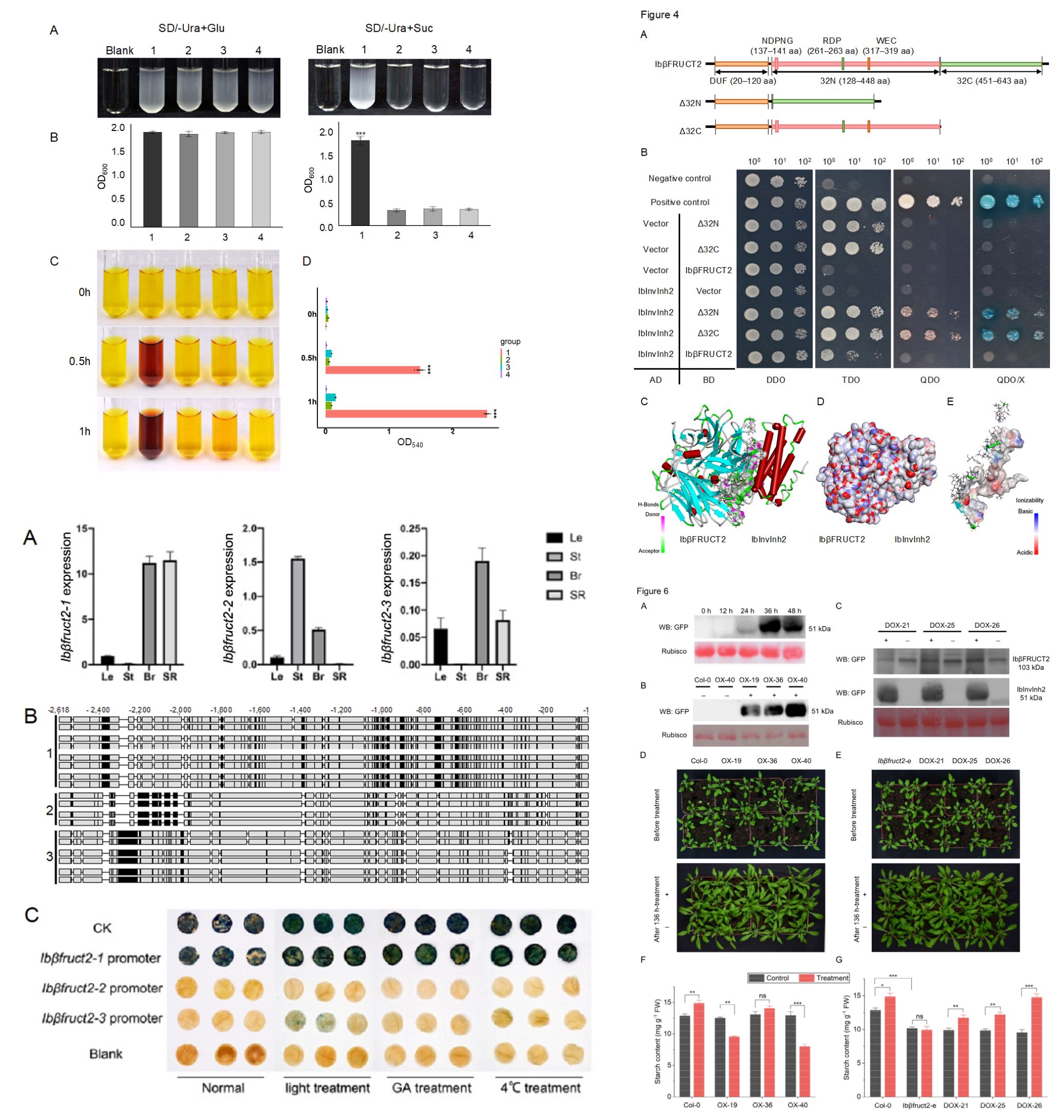 团队通过一系列研究,鉴定出该转化酶的互作转化抑制子IbInvInh2,并发现该抑制子的Thr39和Leu198对互作具有关键作用。Ibβfruct2基因在拟南芥中的异源表达导致淀粉含量显著下降,葡萄糖含量显著升高,说明其负调控淀粉含量性状。诱导表达IbInvInh2导致拟南芥淀粉含量下降,而使过表达Ibβfruct2植株的淀粉含量显著增加,表明转化酶抑制子IbInvInh2通过与IbβFRUCT2互作,协同调控淀粉与糖性状并参与植物胁迫响应。上述研究为甘薯重复基因的功能解析与利用以及重要品种性状遗传改良提供了重要参考信息。
