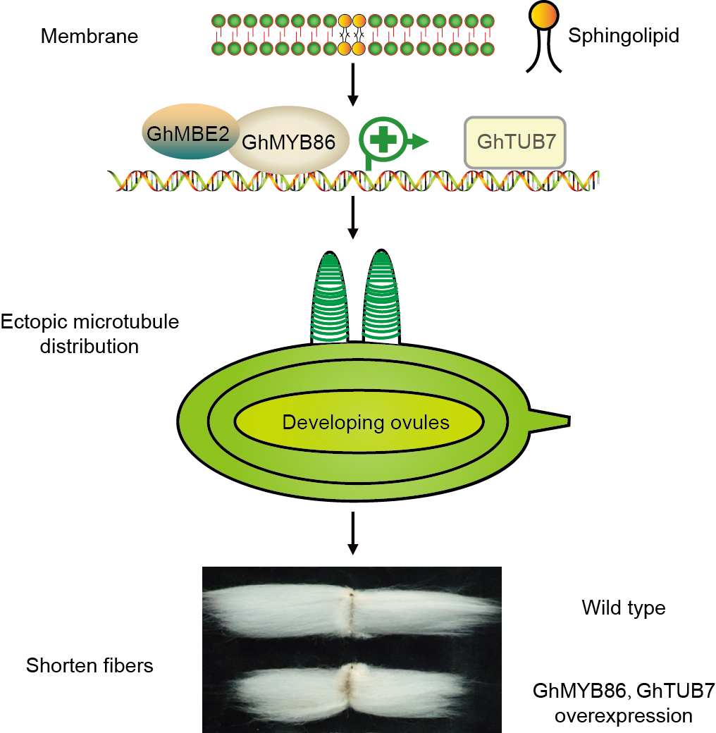 鞘脂合成抑制剂响应基因GhMYB86与GhMBE2互作促进对GhTUB7基因的激活作用,导致纤维细胞中异位的微管排布,造成短纤维表型。