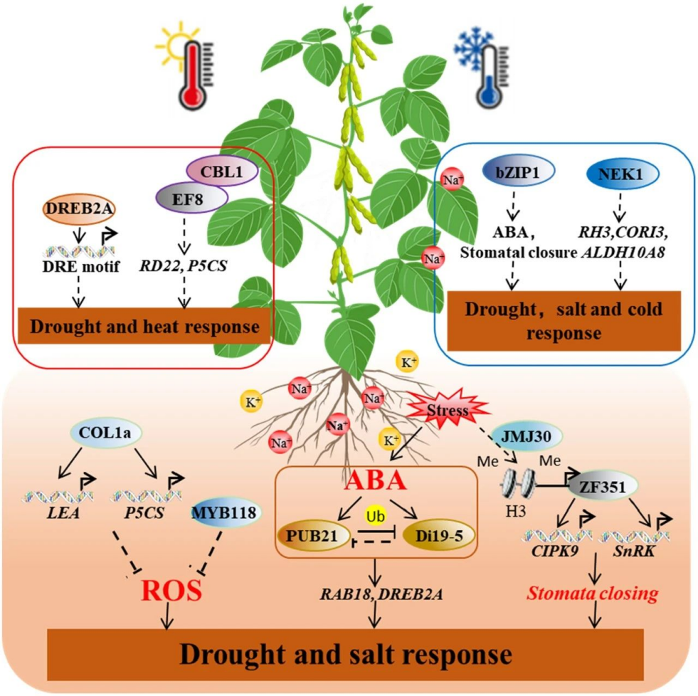 全球气候变暖正加剧干旱、盐碱和极端温度等环境胁迫,严重威胁农作物产量。作为全球重要的粮食作物,大豆不仅为人类提供优质蛋白和油脂,还是畜牧业的重要饲料来源。然而,大豆对非生物胁迫极为敏感,产量损失可超50%!如何培育抗逆性强的大豆品种?