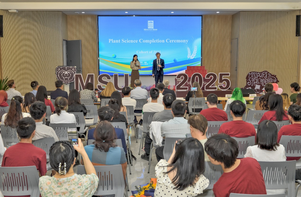5月24日下午, MSU植科2025届结业典礼在南区招聘大厅隆重举行。出席本次结业典礼的嘉宾有密苏里州立大学(MSU)副校长布莱德・博登豪森先生,MSU国际处中国项目办公室主任刘丹丹女士,MSU农学院院长梅丽莎・布莱德索博士,MSU农业科学与保护学系系主任莱西・苏科瓦蒂博士,MSU杰出教授、葡萄生物技术中心主任邱文平,MSU农业科学与保护系讲师雅克布・施奈德,MSU英语系讲师约书亚,一楼一凤