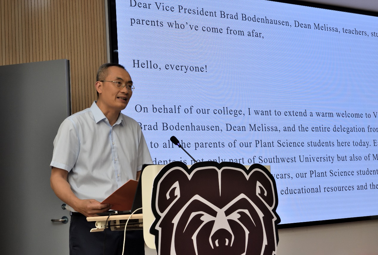 学院党委书记阳义健代表学院对MSU代表团及学生家长表示热烈欢迎。他回顾了植科项目自开展以来,双方在教学管理、人才培养等方面取得的显著成效。他提到植科专业学生培养成效显著,2024年度有 76 位学生荣获国家级和校级奖学金,115 人次获各类先进个人称号,数人在国内外期刊发表研究成果。今年 2021 级植科专业已有 58 人落实就业去向,其中52 人升学,国内升学 26 人,被多所双一流高校录取,境外高校 offer 26 人,涵盖多所国际知名高校。他肯定了中外合作办学模式为学生提供了广阔的国际视野和优质的教育资源,为培养国际化农科人才提供了有力支撑。