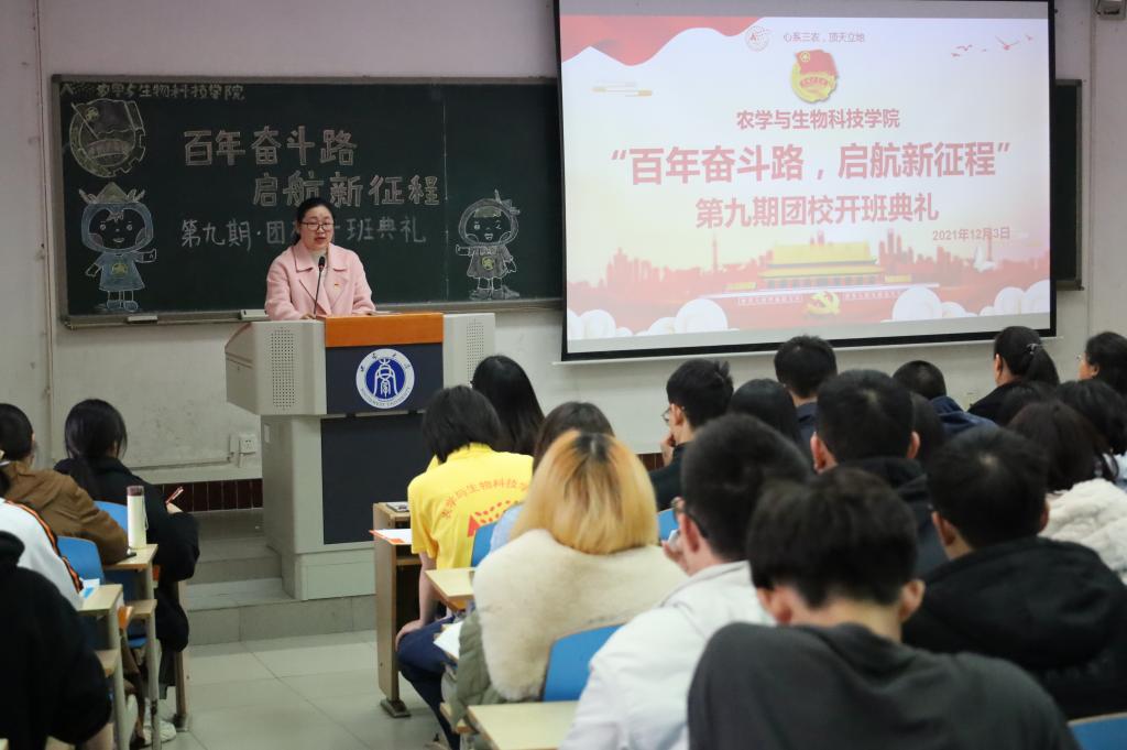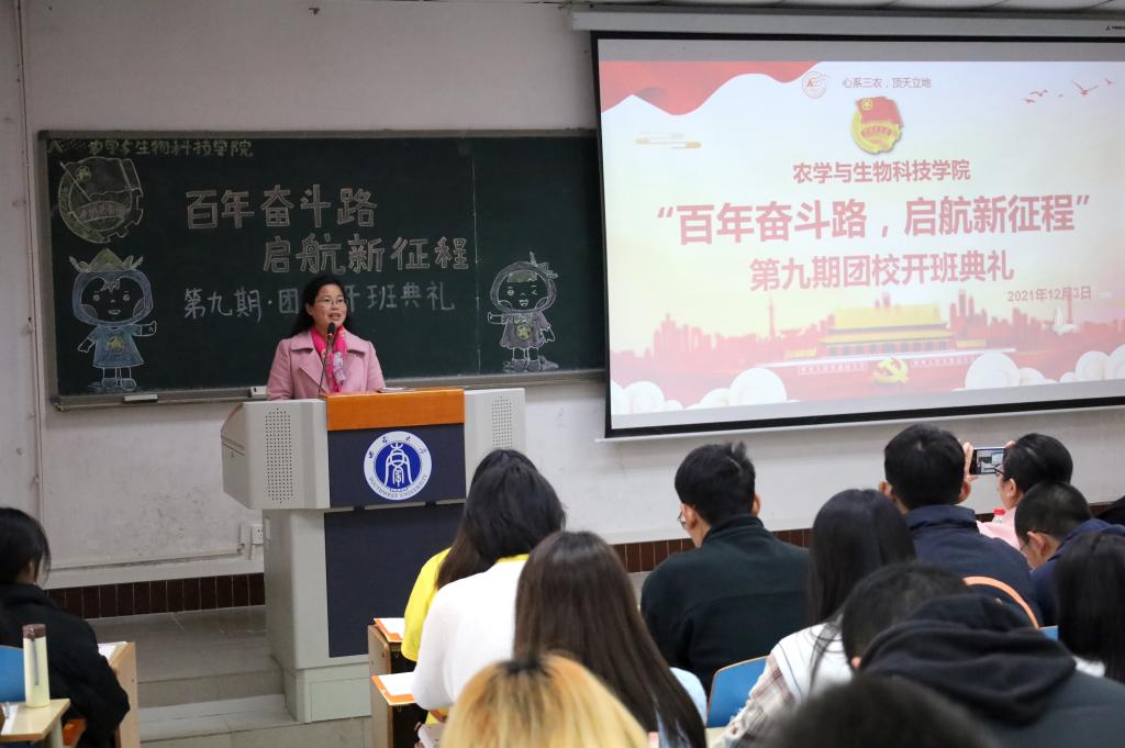 为贯彻落实习近平总书记“七一”重要讲话精神,深入学习党的十九届六中全会精神,从百年党史中汲取智慧和力量,为开启社会主义现代化建设开启新征程培养一批对党忠诚、信仰坚定、素质优良、作风过硬的团学青年骨干,农学与生物科技委员团委举办以“百年奋斗路,启航新征程”为主题的第九期团校培训班。2021年12月3日下午2:30,团校培训班于32教313教室举行开班典礼及第一次理论讲座。校团委副书记张瑜老师、学院党委副书记郑莉佳老师、学院团委书记许莹竹老师出席开班典礼,来自学院团委、学生会、各社团组织、各班团支部的团学骨干构成的160名学员共同参与,典礼由学院团委副书记胡芝雪主持。