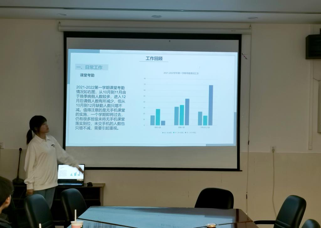 首先,各部门负责人围绕思想引领、成才服务、权益维护、自身建设、对外宣传等方面,依次进行工作述职。述职汇报以PPT展示和演讲的形式进行,既有对工作特色亮点的展示,也有对工作不足深刻总结和下一步工作打算的谋划。体育部在本学期完成了新生运动会、羽毛球联赛、“太阳杯”排球联赛以及“新生杯”篮球联赛中负责选拔、训练等重要工作。学科部在课堂考勤、辩论赛举行、学术论文大赛、笔记评选大赛、“学霸说”栏目建设等工作中取得了一定成效。宣传部负责学生会官Q和公众号的运营以及各活动的宣传,对新闻报道时效性不足等问题进行了反思。组织部在本学期完成了团组织关系转接、“青年大学习”的督促、各团支部“每周一学”活动开展和第九期团校培训班的举办等工作。就业创业部举办了简历大赛和完成了各大创新创业赛事的组织动员工作。办公室在物资管理、财务报账、内部枢纽、对外联络方面为各项活动开展提供了后勤保障。文娱部牵头完成了“植沐风雨 盛世芳华”2021年一楼一凤