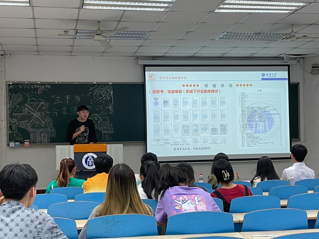 随后,2021年“三下乡”实践活动中的优秀代表林正雄同学上台分享经验与感悟。他首先用通俗易懂的话语为大家讲了“什么是三下乡”,紧接着,他以自己策划组织的“三下乡”活动为例,为大家讲了“三下乡活动怎么开展”,以专题问卷调研、惠农政策宣讲、乡村支教夏令营与专家实用技术讲座等特色活动为同学讲解。林正雄强调,调查一定要结合当地实际情况,而不盲目追随当下的热点,要切身实地为当地发展贡献力量,用具体详实的数据和当地方言向村民们解读国家新政策,帮助村民了解政策内容,也要结合自身专业奋力探索乡村振兴新道路。