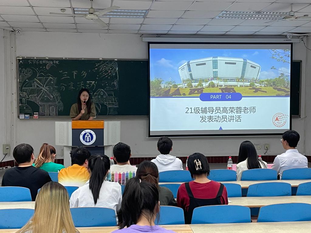 最后,2021级辅导员高荣蓉老师上台做动员讲话。她首先分享了自己的下乡经验。她谈起自己曾前往重庆市城口县、江西省井冈山、湖北省、陕西省多地进行社会实践的经历,虽然过程都很辛苦,但每一次都会有所成长与收获。老师语重心长地教导同学们,只有吃得苦中苦,方为人上人,越是艰苦的环境越值得为此去奋斗,在活动中也要认清自身定位,将自己视作设计者、策划者而不仅仅是参与者。只有经过实践历练,才能有所突破,高老师鼓励同学们暑假动起来,积极报名参加实践活动。