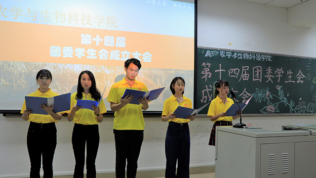 学术科技部干事邓超同学作为代表进行发言,他号召大家团结起来,谱写农生的新故事。为抵制学生组织中存在的官僚作风、功利化、庸俗化等问题问题,主席团集体宣读了《学生会、研究生会干部自律公约》倡议书,向全体同学发起倡议,为建设一支胸怀理想、心系同学、品学兼优、作风扎实的工作骨干队伍作出努力。办公室干事江青莲同学带领全体同学做成立大会上的宣誓,整齐响亮的誓言是全体学生会成员的工作指南。
