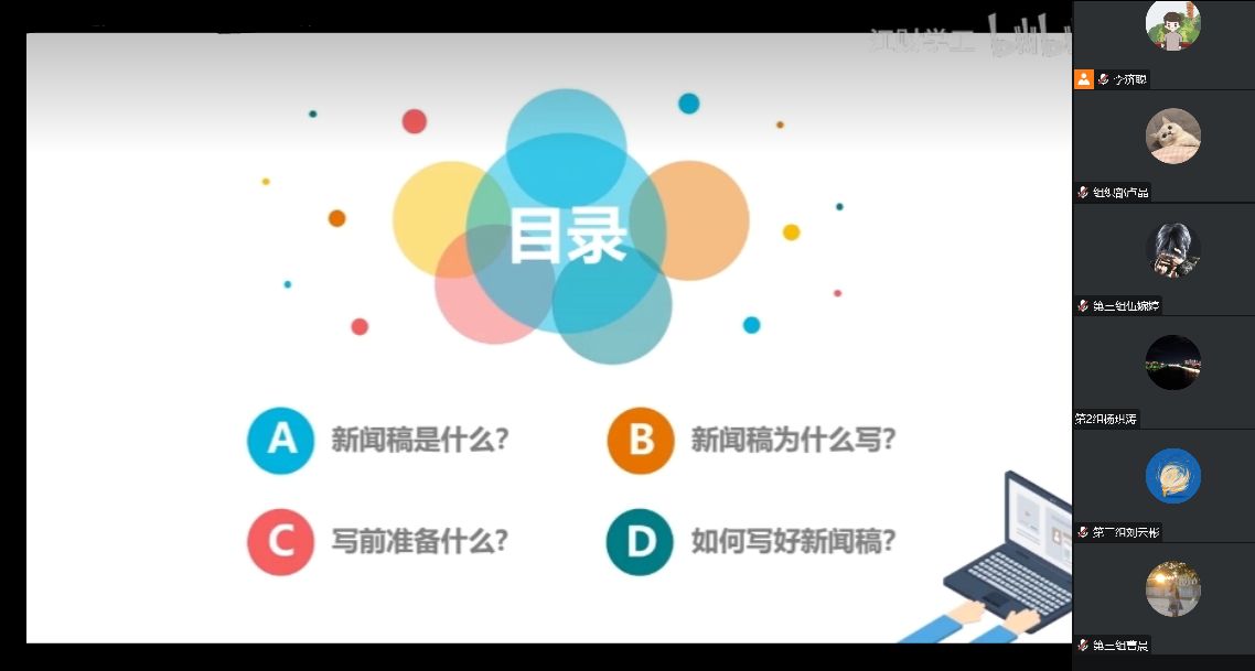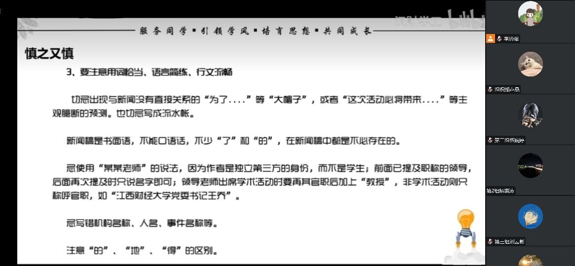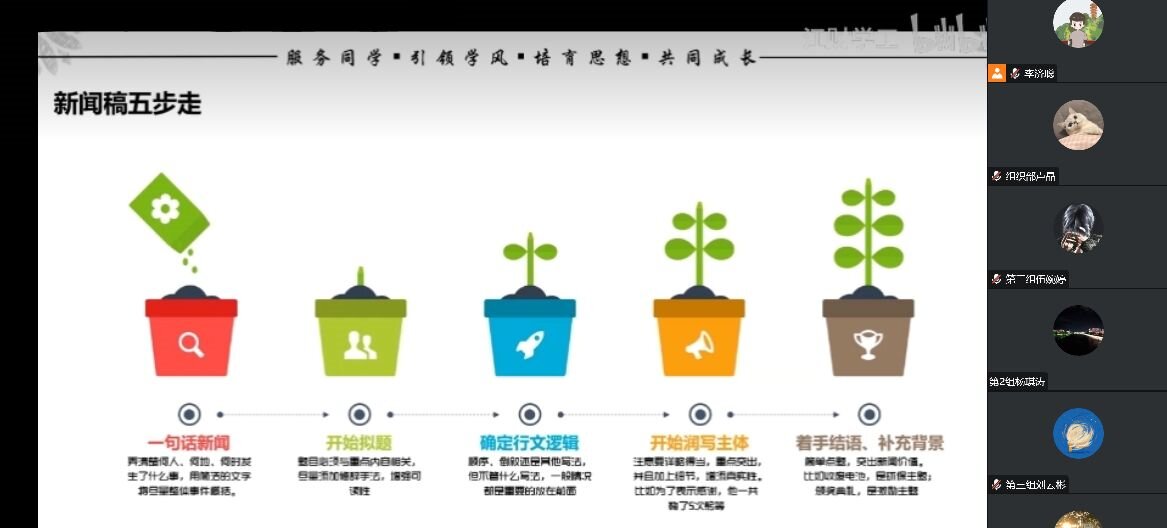 针对团学骨干总结提炼、语言表达、新闻宣传等方面的能力薄弱的情况,本群团校特别安排了相关视频课程的学习,包括工作汇报专题模块与新闻稿撰写专题两个部分。