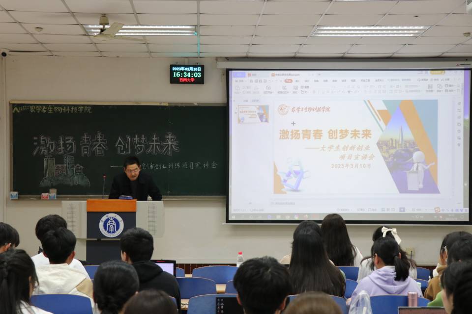 于32教314教室举行大学生创新创业训练计划项目宣讲会,学院副院长张建奎老师、2021级隆平班班主任兼大创项目指导老师李云峰教授、2021级辅导员高荣蓉老师出席活动,2021级隆平实验班全体学生及其他各年级各专业学生参与,宣讲会由学院学生会就业创业部工作人员邱浩宇同学主持。