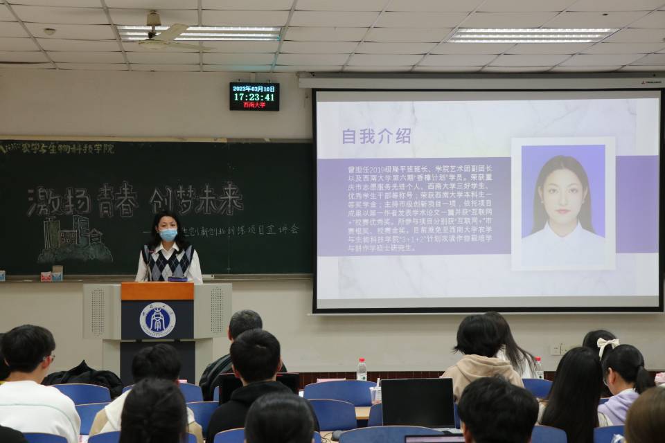 推免至学院作物栽培学与耕作学继续攻读硕士研究生的2019级隆平实验班阳新月同学就自己参加大创项目的感受与收获与同学们交流分享。她向在座同学提出两个问题并希望大家认真思考清楚,一是问自己为什么要做大创项目,二是自己想从参与大创项目的过程中获得什么。她提醒大家,做大创需要注重过程,要看到这段经历让自己哪方面得到提升,而不应只关注结果。“做大创应降低期待,全力以赴;应专注自身,重在过程,沉淀自己;应分清主次,课程任务优先,不要因小失大。”