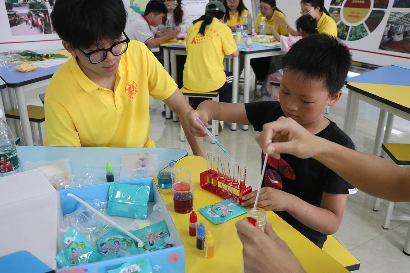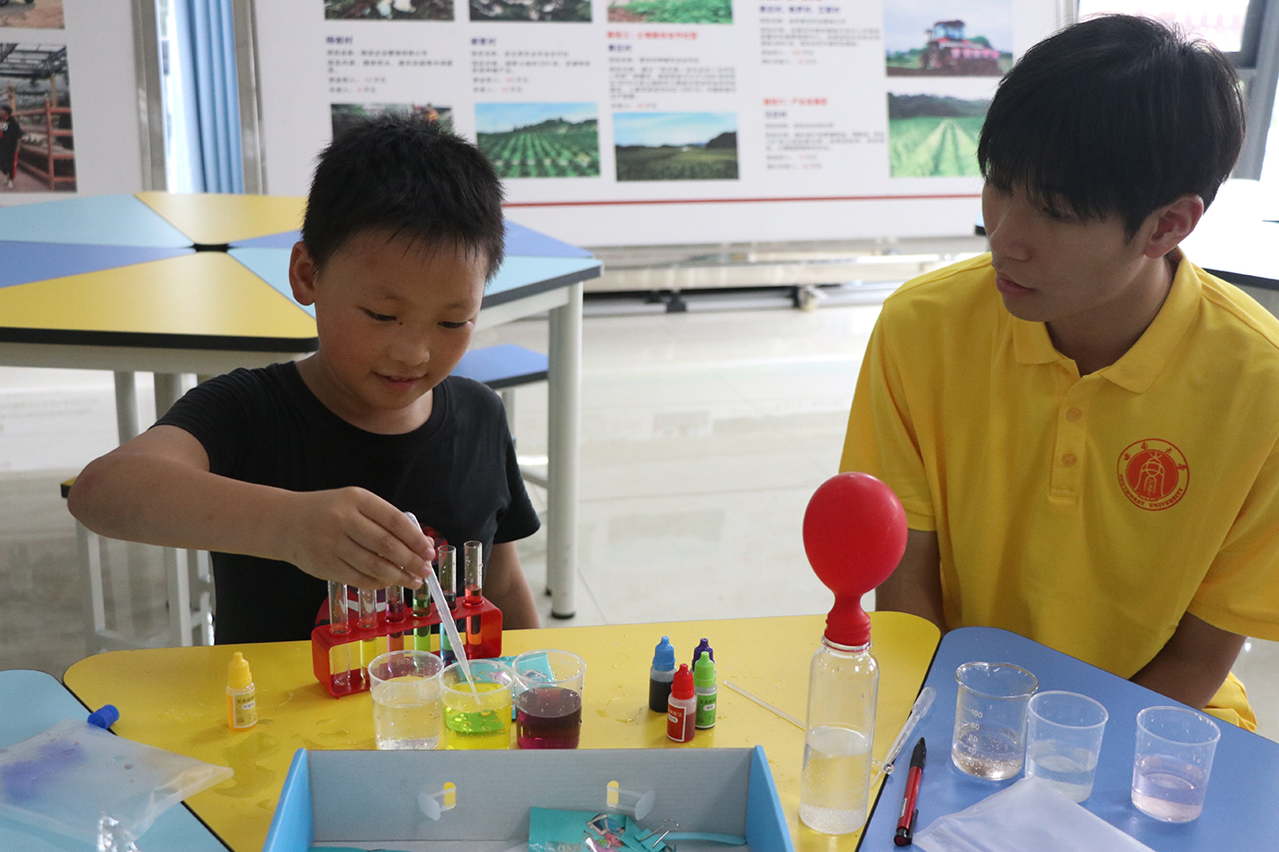 向空瓶中加入水和柠檬酸,随后加入小苏打,气球在化学反应产生的气体作用下逐渐膨胀,实践团成员范鑫宇同学演示“生气的气球”实验让小朋友们亲眼见证了科学的魔力。实践队员还为小朋友们演示了“无字天书”,“饮料脱色”等实验,以其趣味性和教育性,让小朋友们在轻松愉快的氛围中学习科学知识。在实践队员的引导下,小朋友们认真听课,积极参与到实验操作中,不仅体验到了科学探索的乐趣,收获了丰富的科学知识,更提高了动手实践能力。