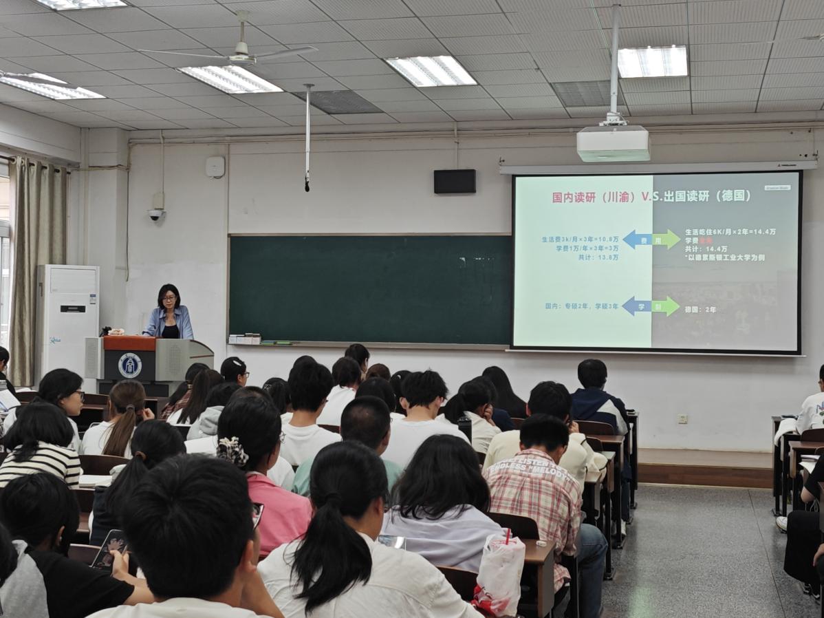 国际教育中心王老师系统介绍了德国高等教育的优势与特点,梳理了留德申请的关键流程与准备要点,并分享了往届学生在德学习生活的真实经历,有效增进了同学们对海外留学的了解。冉老师则重点解读了国内保研政策的最新动态与具体要求,通过分析历年升学数据为同学们评估自身定位提供了参考,并详细介绍了学校为支持学生深造所提供的各类服务资源。
