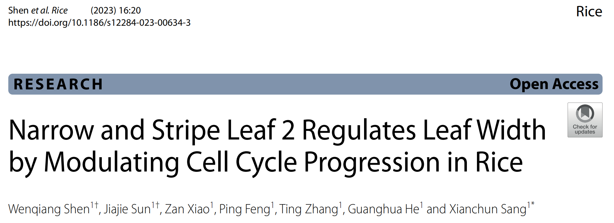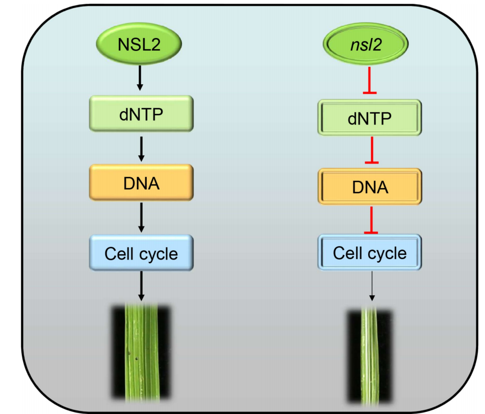 水稻研究所从EMS诱变体库中分离鉴定到一个水稻隐性窄条纹叶突变体nsl2 (narrow and stripe leaf 2),并据此图位克隆了目的基因NSL2,编码核糖核苷酸酶小亚基RNRS1。前人研究表明RNRS1参与调控水稻叶色及花器官的发育,但在叶型发育中的功能还未知。我们进一步研究发现,NSL2/RNRS1通过影响dNTP的合成,进而阻碍DNA的合成,导致细胞分裂速率降低,从而调控叶片宽度,这为进一步阐释RNRS1功能奠定了基础。该研究“Narrow and Stripe Leaf 2 Regulates Leaf Width by Modulating Cell Cycle Progression in Rice”近期发表在农学一区杂志《Rice》上,2022IF=5.638。博士后沈文强老师为第一作者,2018级隆平班本科生(农学专业)孙佳婕为共同第一作者,桑贤春老师为通讯作者。该论文受到了重庆市博士后科学基金(cstc2021jcyj-bshX0076)、国家自然科学基金(32171964)和重庆市自然科学基金创新群体(cstc2021jcyj-cxttX0004)项目的资助。