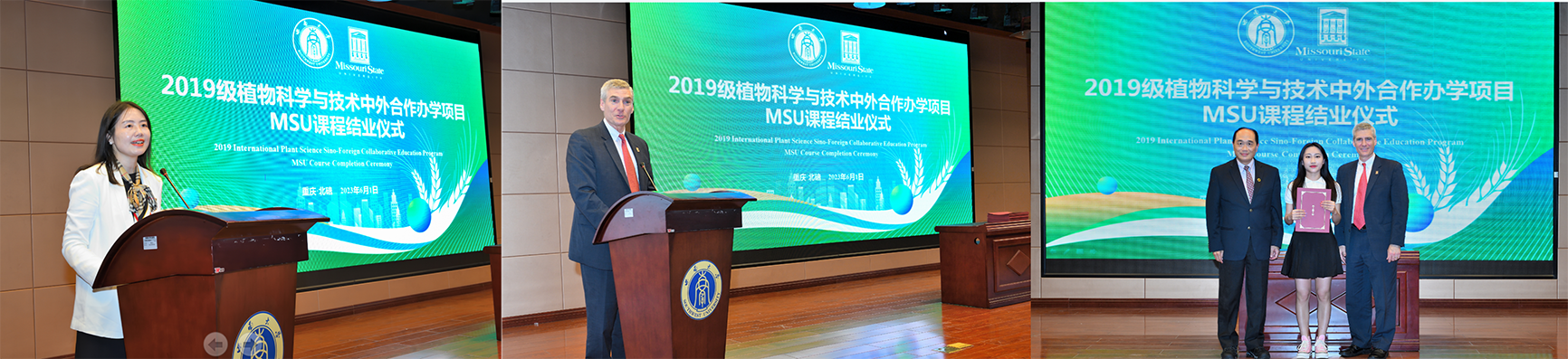 在结业仪式上,胡琳副处长首先代表学校,对布莱德·博登豪森一行的到来表示感谢,对双方领导和老师为植科专业的付出表达了感谢,同时对即将毕业的2019及植科学生,也表达了中心的祝福。布莱德·博登豪森副校长在致辞中表示,希望2019及植科的同学们积极参与社会事务,带动中美文化交流,用乐观的态度在各自领域中不断奋进;希望每一位毕业生都能够将公民精神、家国情怀和个体价值紧密结合在一起,做堪当民族复兴大任的时代新人!2019级植科专业毕业生代表杜润杰分享大学四年所学所知、所思所悟,表达了对同学和朋友的不舍之情,表示将谨记学校、学院、老师们的教诲,努力工作,回报社会。最后,吕典秋院长回顾了4年来植科专业的建设与发展,以及植科学子的成长和成才。2019级是植科专业开始中外合作办学以来招收的第一届学生,依托中外合作办学的良好平台,经受住了疫情防控等复杂国际形势的严峻考验,得到了全面成长。希望同学们毕业后,继续秉持良好的发展态势,把握时代脉搏,在奋斗中继续书写最美青春故事!