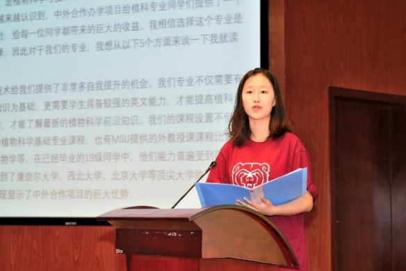 ,并于17日上午,与植物科学与技术(中外合作办学)专业的4个年级在校生以及部分家长代表,举行了一场盛大的中美校区交流会。交流会上,来自2021级植科1班的学生代表杨潇然,向参会的领导、师生和家长代表做了“好风凭借力 送我上青云”的主题发言。